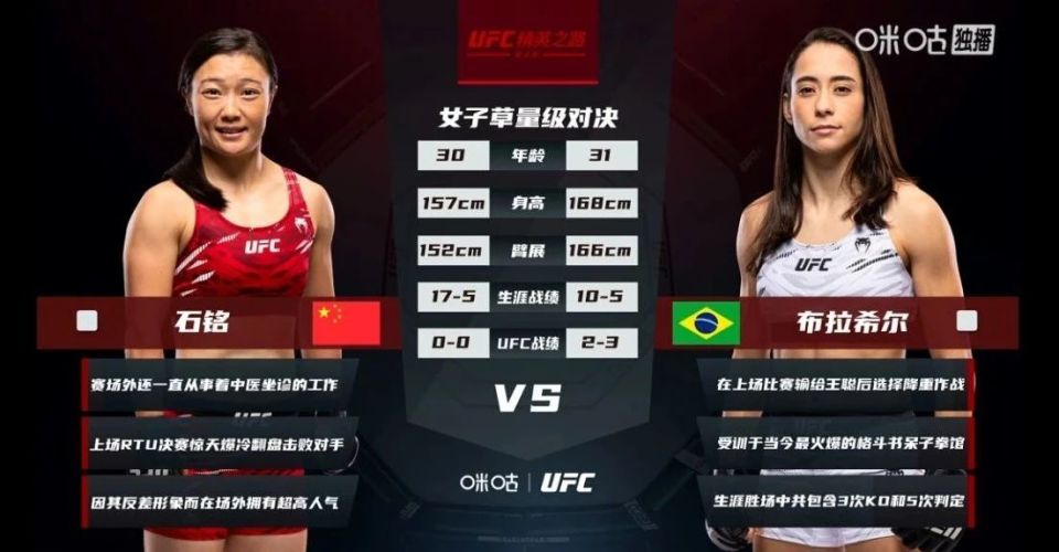 通过赛前给出的数据对比可以看出,布拉西尔的身高、臂展明显占优。而她5场UFC正式比赛的经验,也是石铭不具备的。
